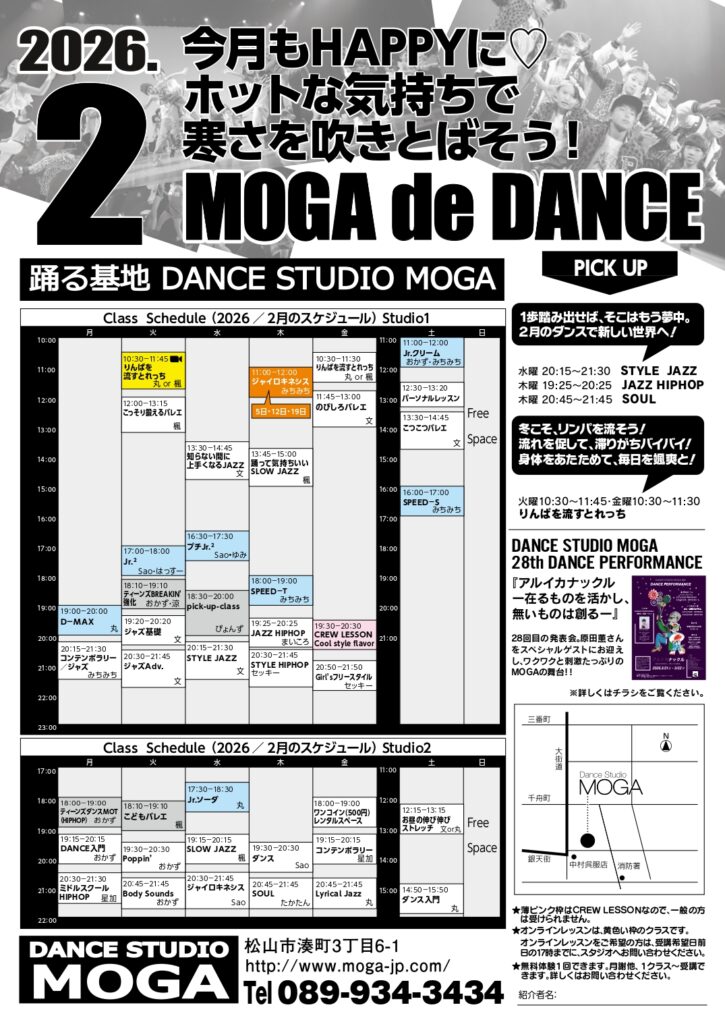 2月のレッスンは、人数制限があるため予約優先制となります。確実にレッスンを受講されたい方は、月謝購入をお勧めいたします。また、5・10クラスチケットについては、受講するレッスンをご連絡いただければ予約の確定ができます。(確定をした場合、キャンセルはできませんので、ご了承ください。)